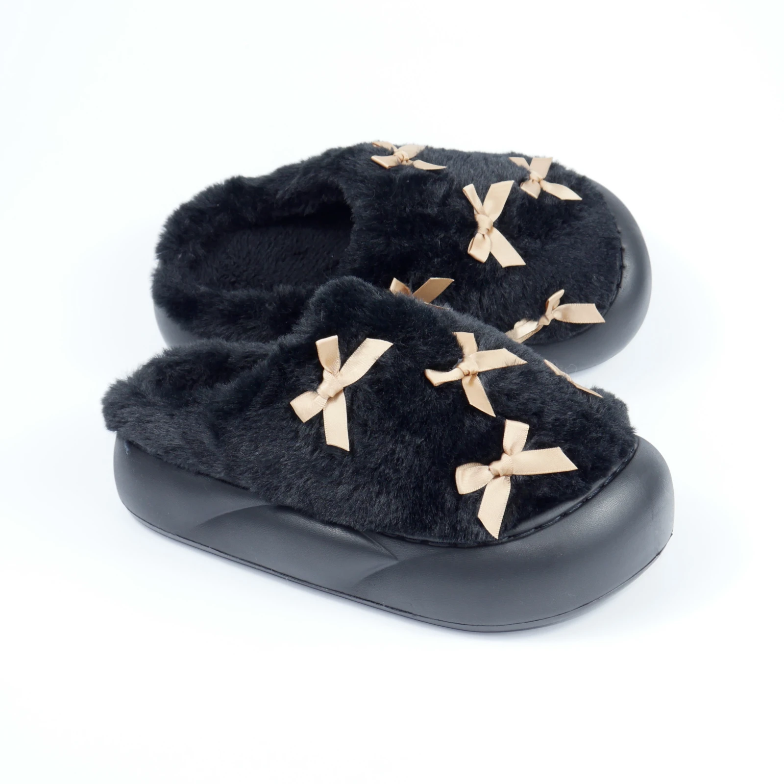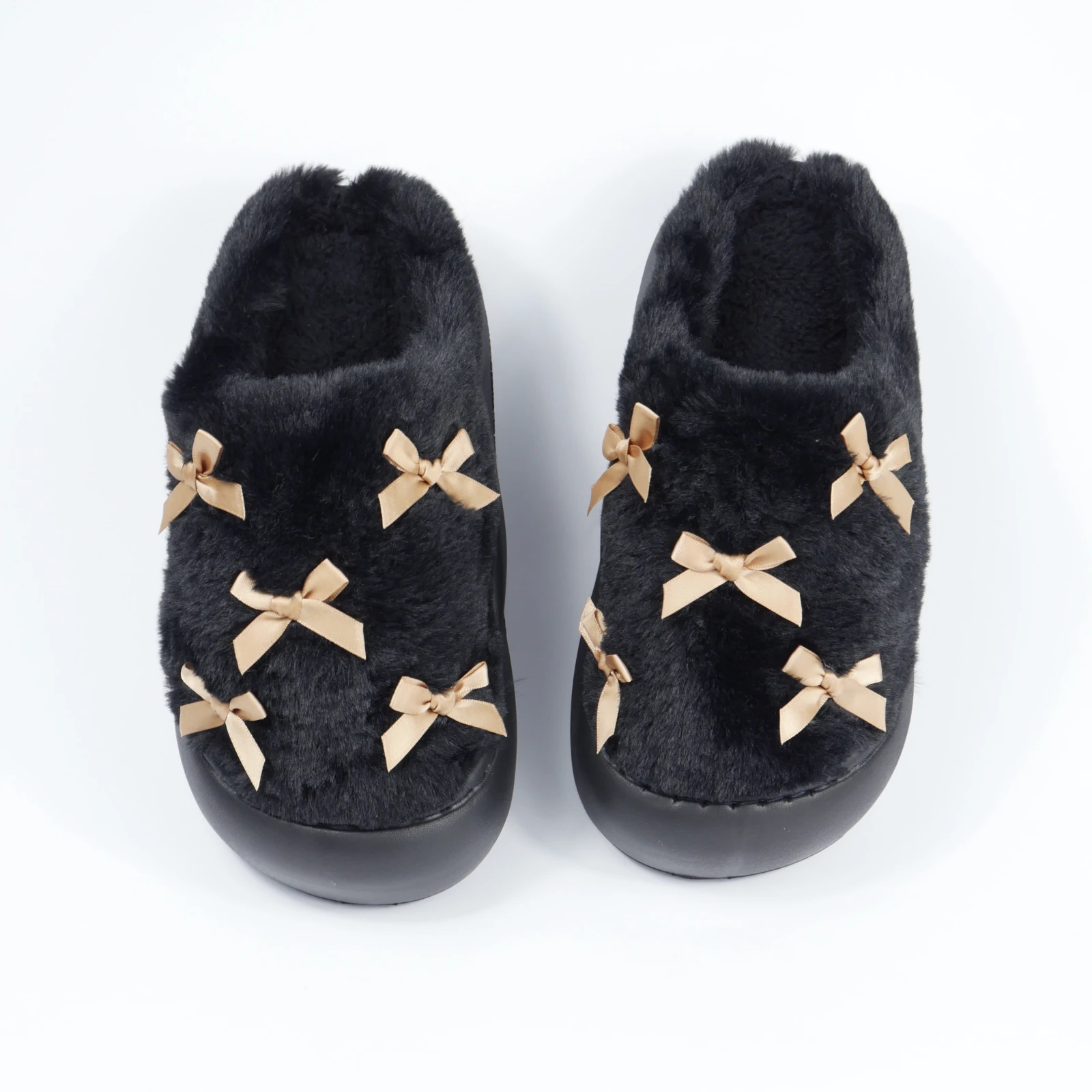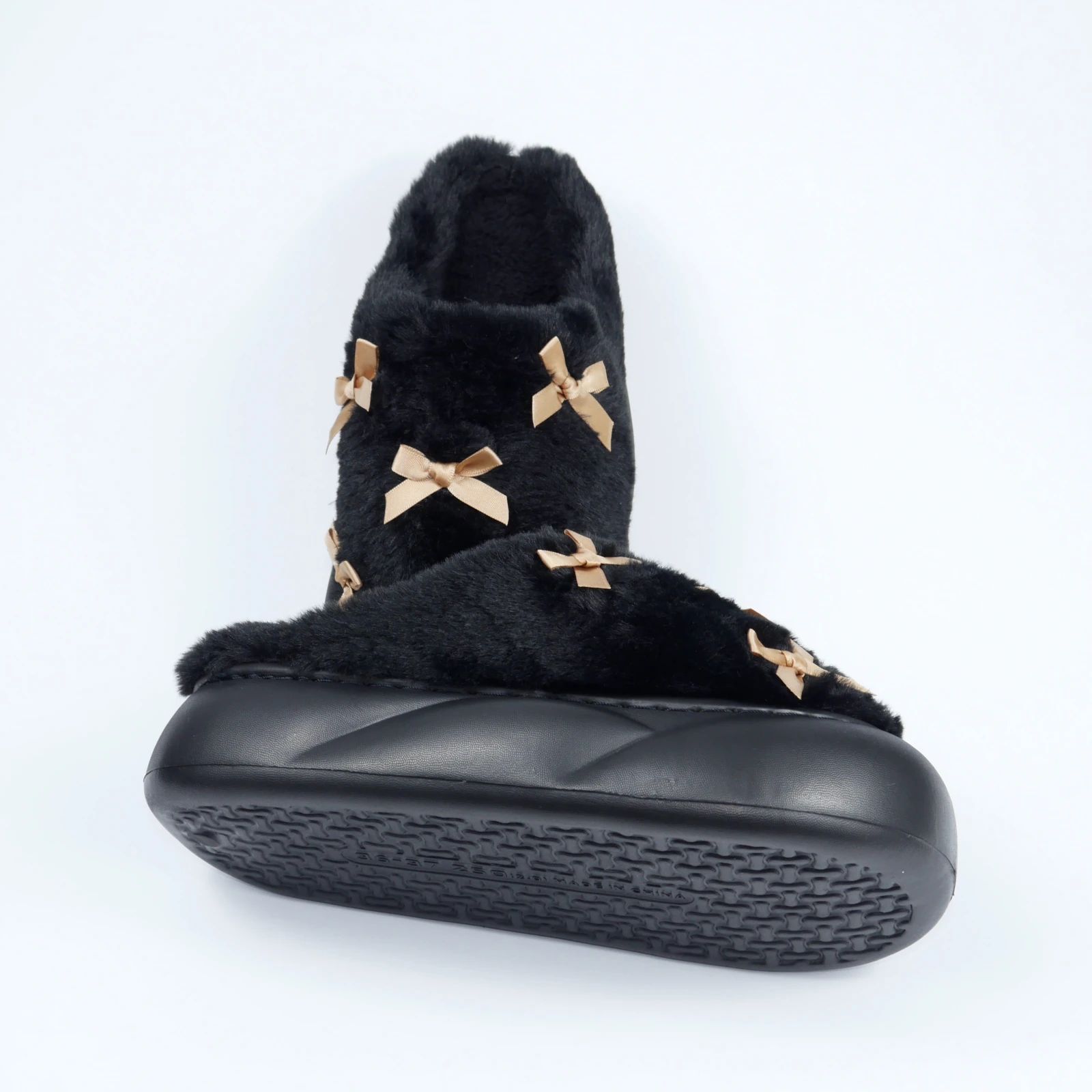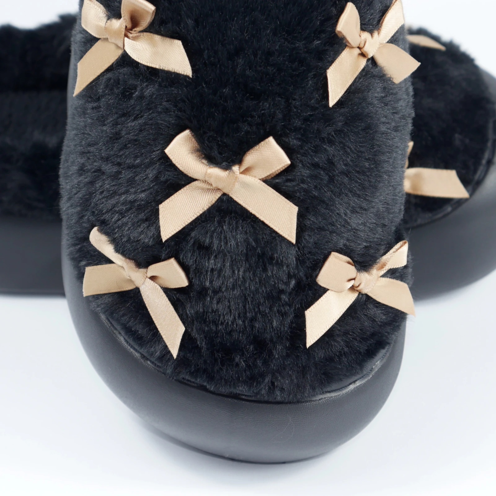 Женские домашние тапочки с бантиками в черном цвете подойдут тем, кто хочет совместить уют и аккуратный домашний стиль. Пушистый верх создает мягкий объем, а светлые бантики делают модель заметной, но не перегруженной. Поэтому эта пара воспринимается как стильные женские домашние тапочки, а не как обычная базовая обувь для дома.