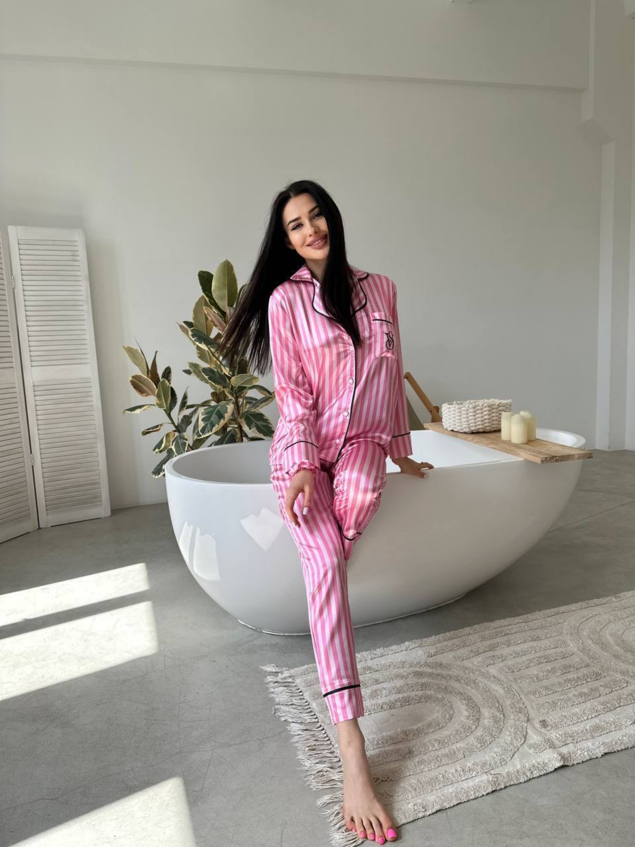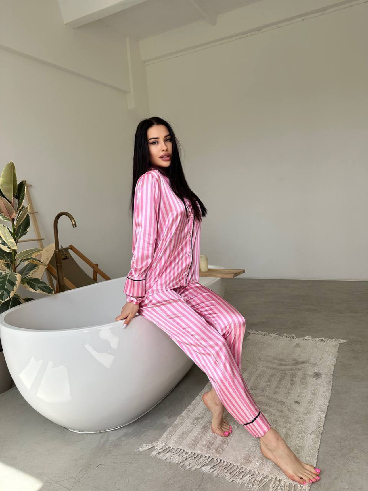 Стильна жіноча піжама з м’якого сатину поєднує комфорт і елегантність. Легка тканина приємна до тіла, а класичний крій ідеально підходять для сну та відпочинку вдома. Рожевий смугастий дизайн додає образу ніжності ✨