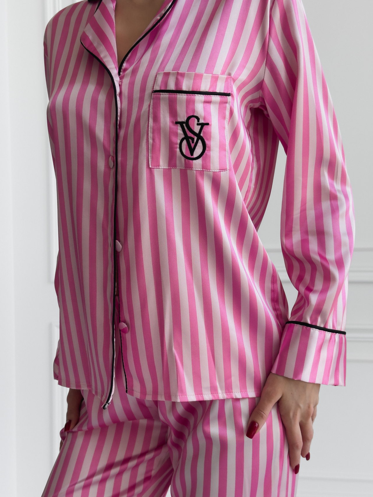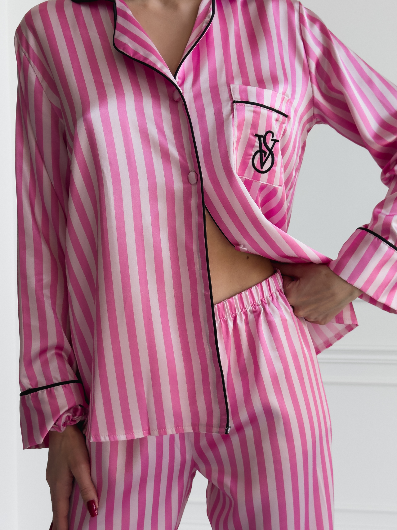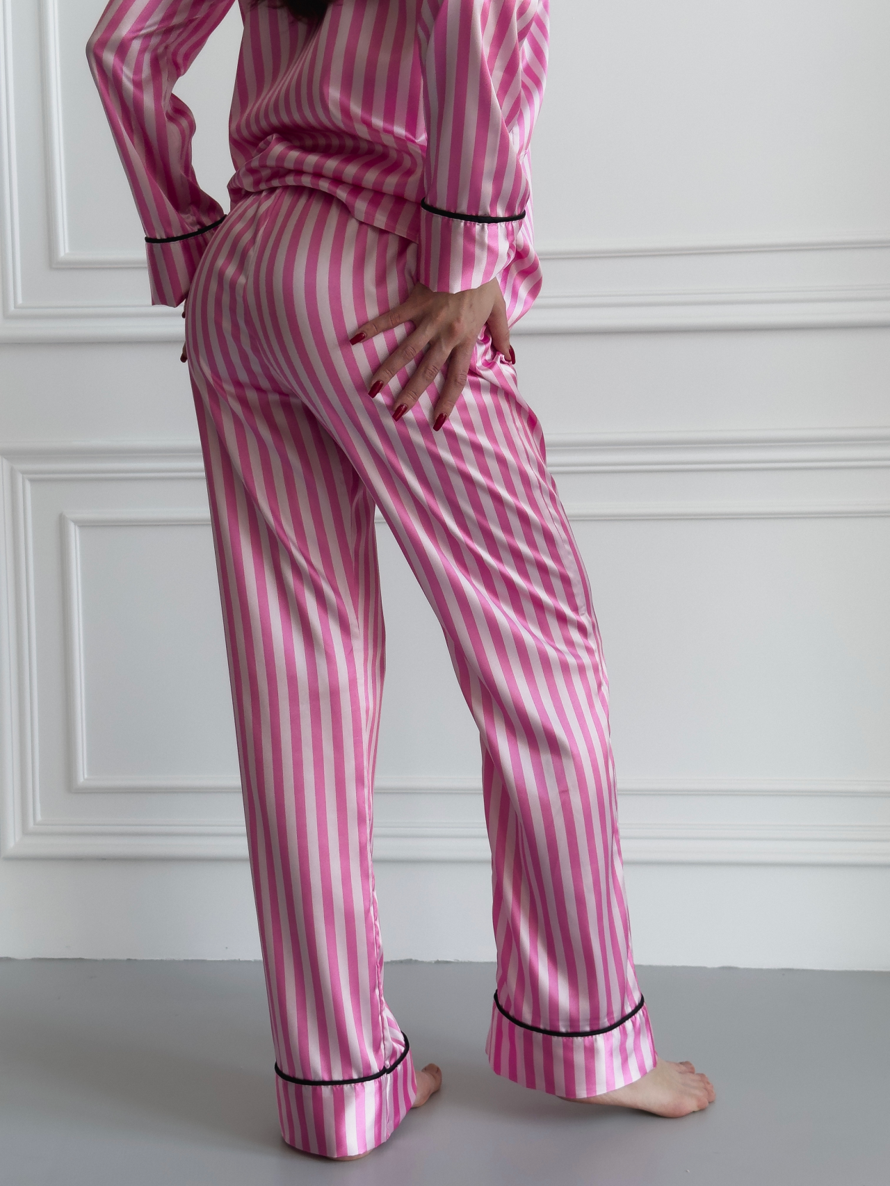 Жіноча сатинова піжама в рожеву смужку — домашній комплект штани + сорочка