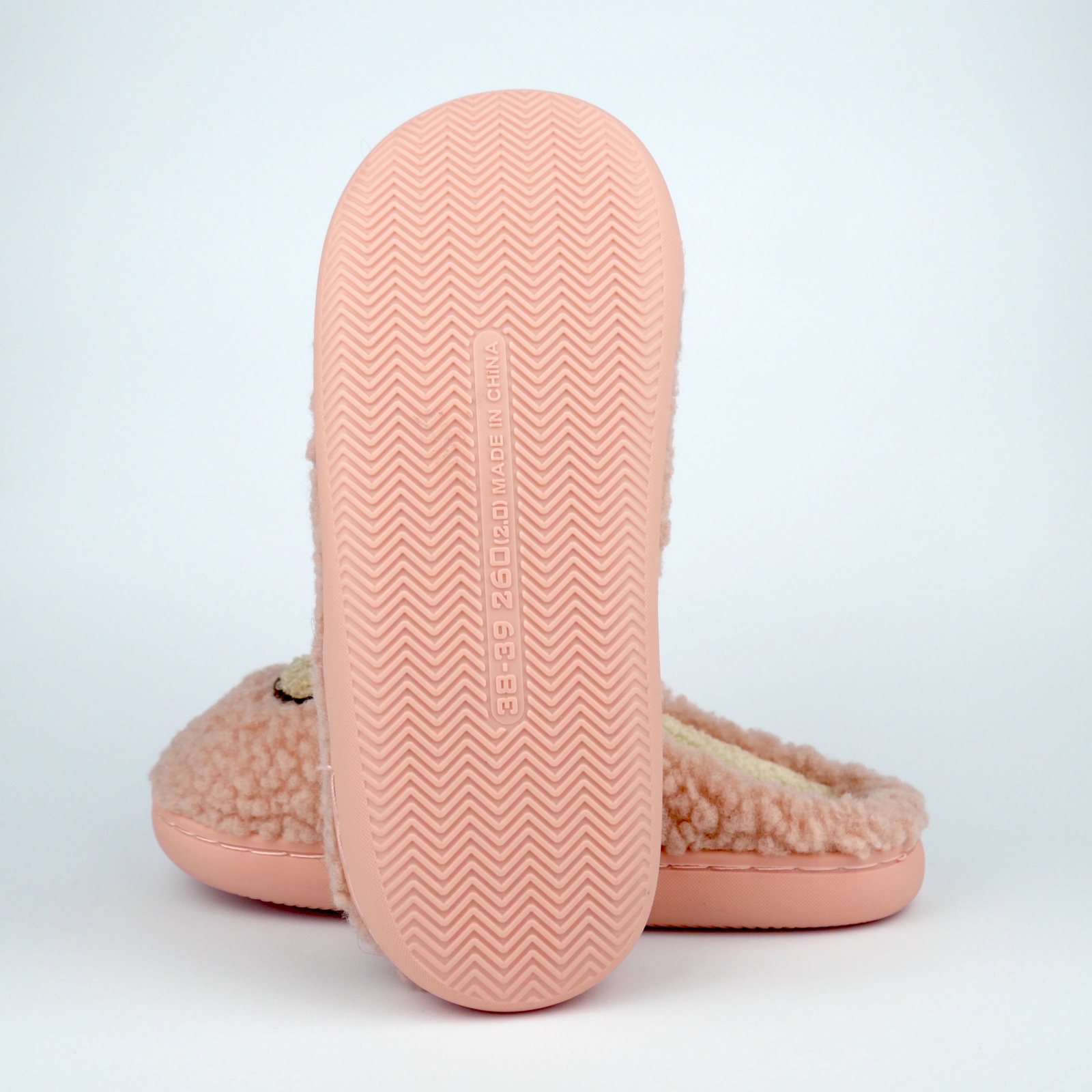 Це м’які закриті тапочки ніжно-рожевого кольору з плюшевого матеріалу. Усередині мають теплу підкладку для комфорту, а спереду прикрашені милим зображенням ведмедика. Ідеальні для дому в холодну пору року.