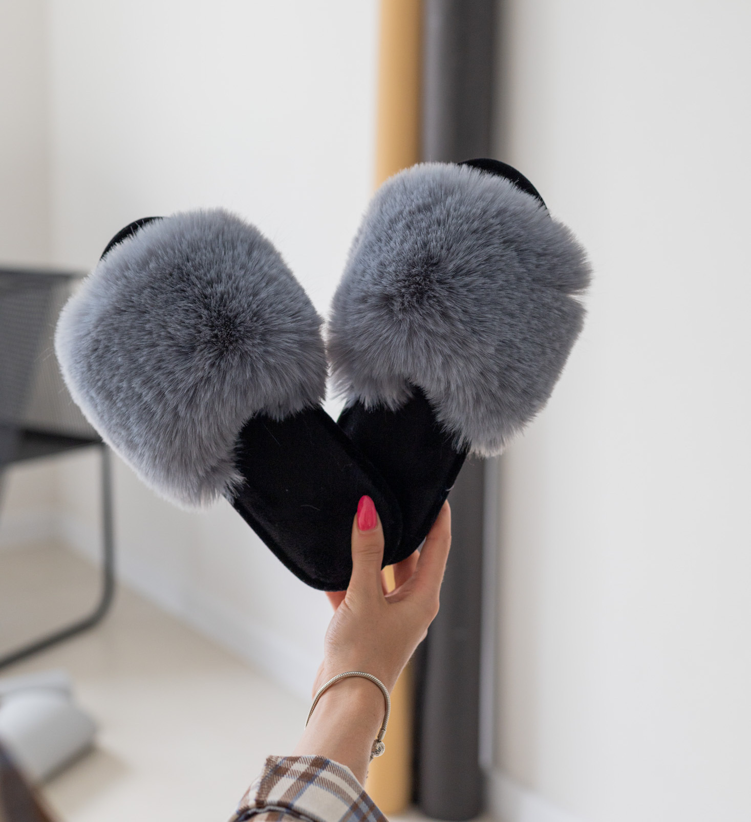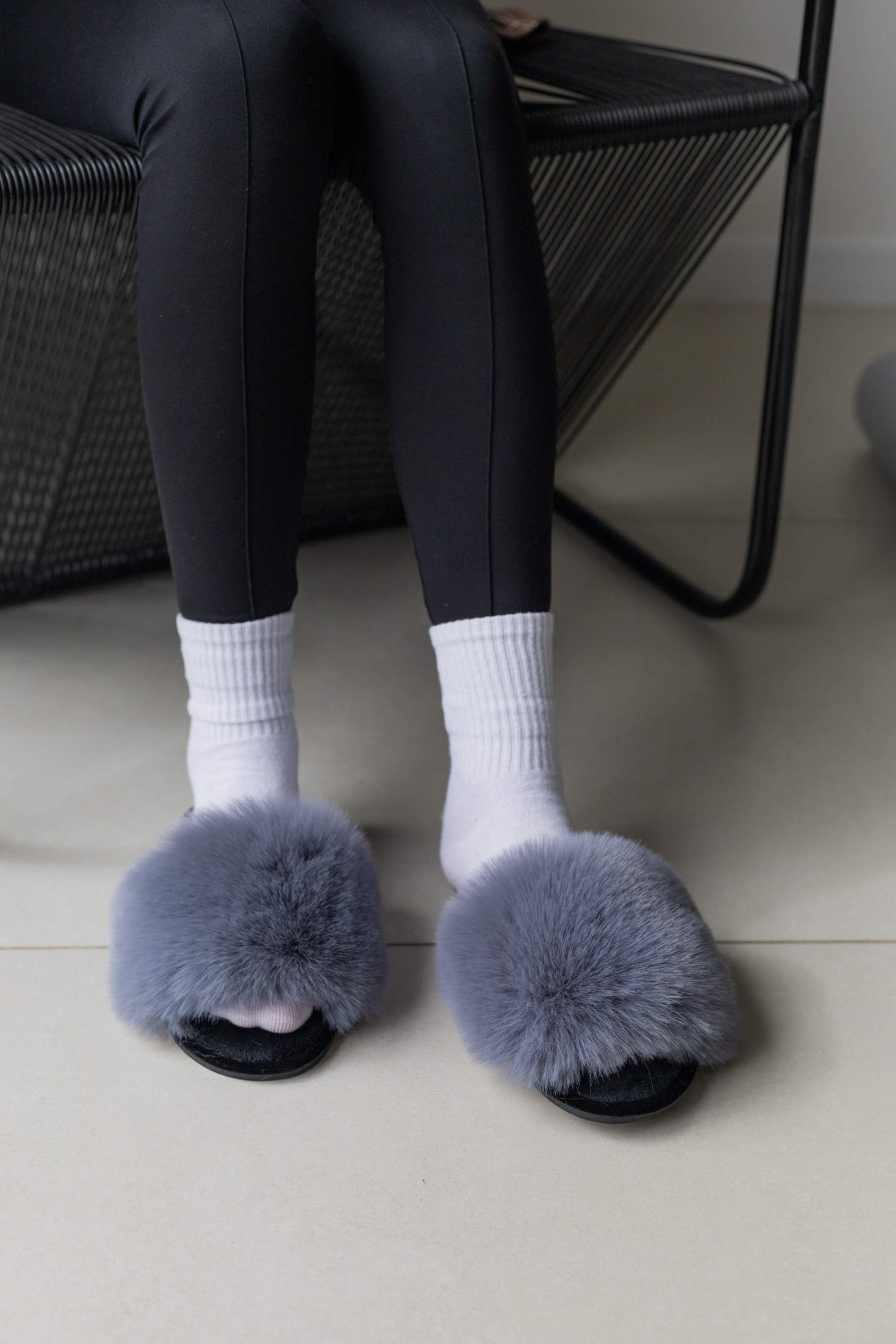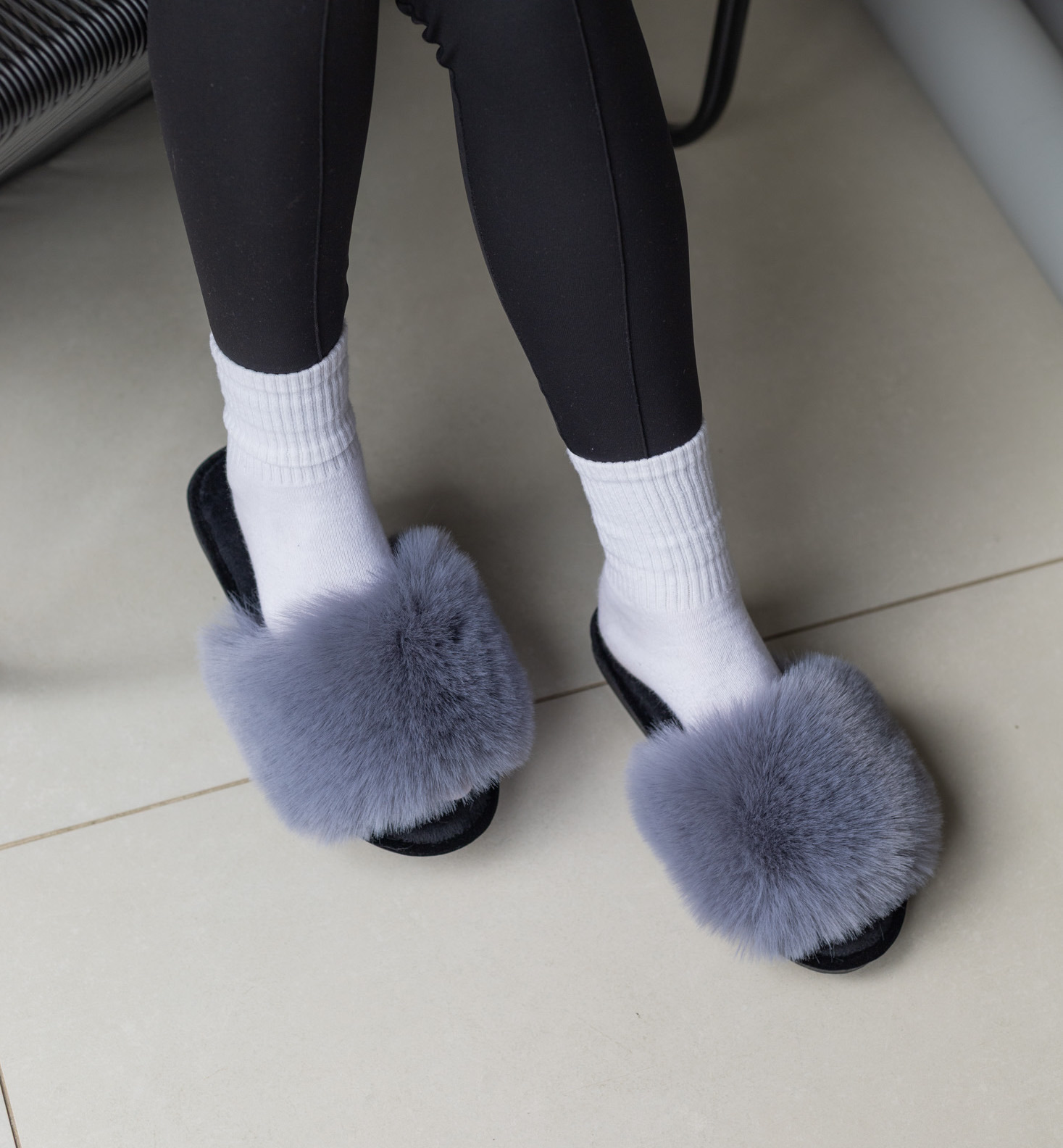 Стильні сірі пухнасті капці з густим м’яким хутром — теплі, легкі та надзвичайно комфортні. Універсальний колір і зручна підошва ідеально підходять для щоденного домашнього відпочинку.