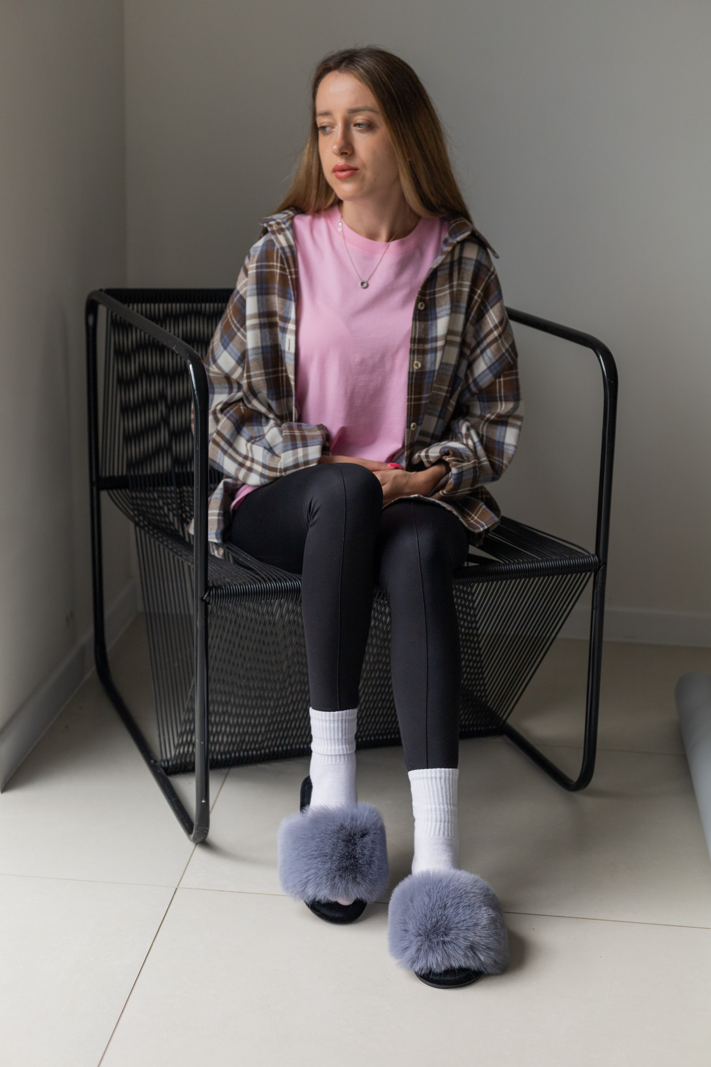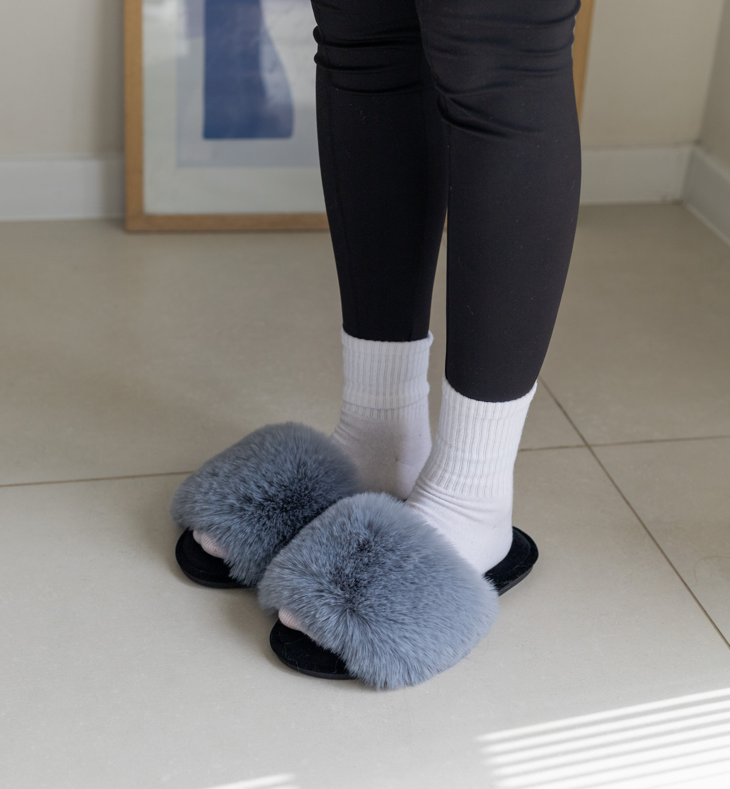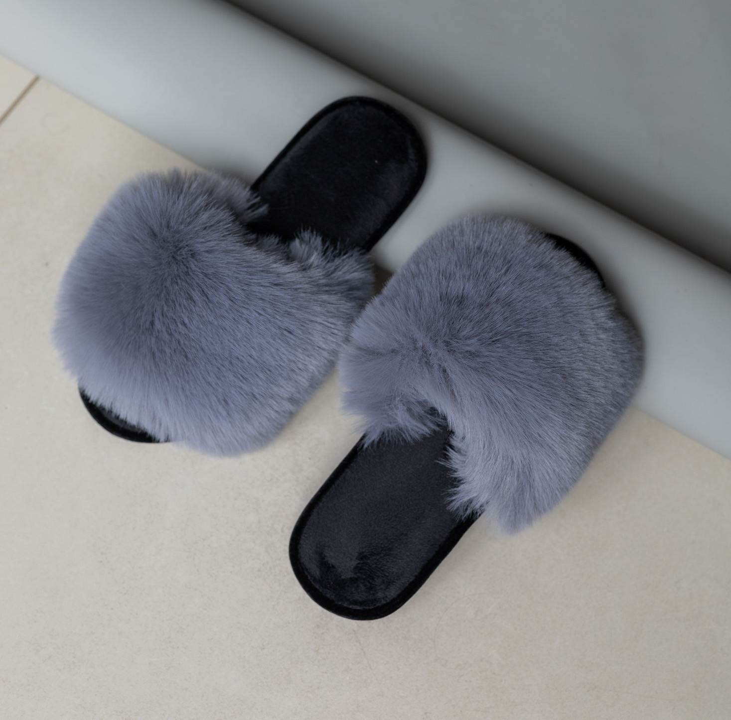 Стильні сірі пухнасті капці з густим м’яким хутром — теплі, легкі та надзвичайно комфортні. Універсальний колір і зручна підошва ідеально підходять для щоденного домашнього відпочинку.