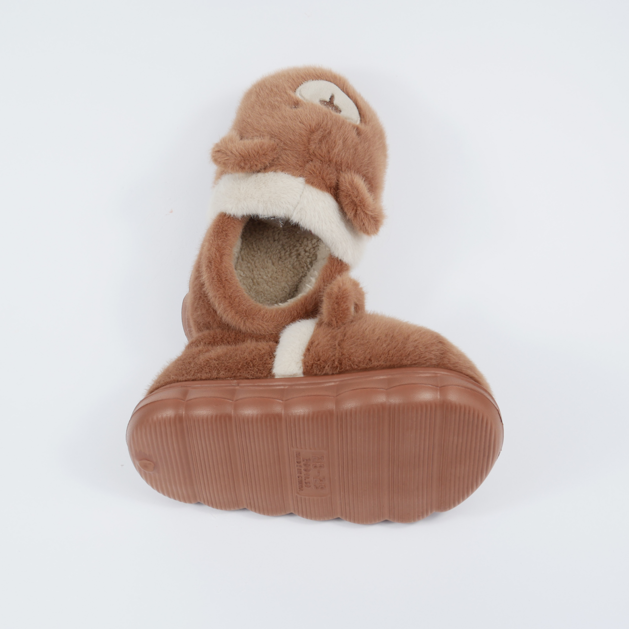 Теплі плюшеві тапочки коричневого кольору з дизайном у вигляді милого ведмедика та маленькими вушками стануть найкращими друзями для ніжок вашої дитини.