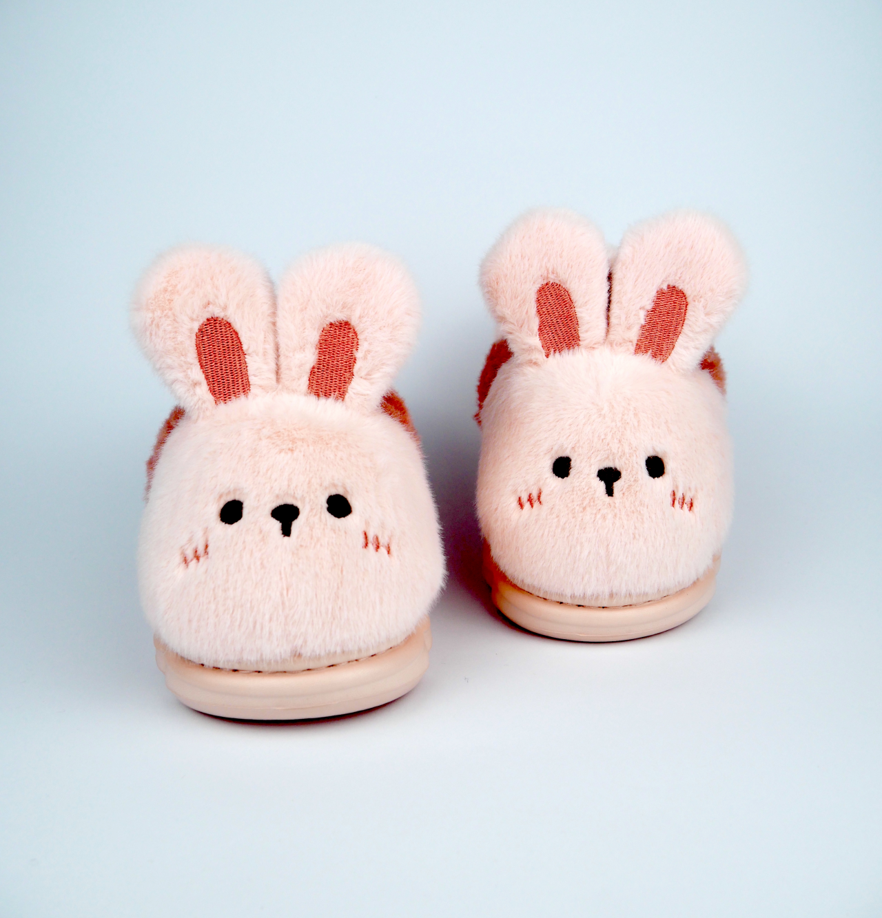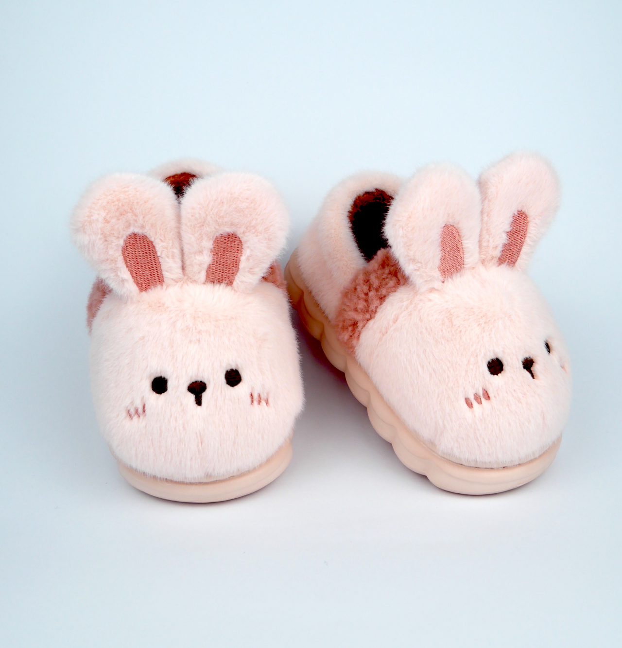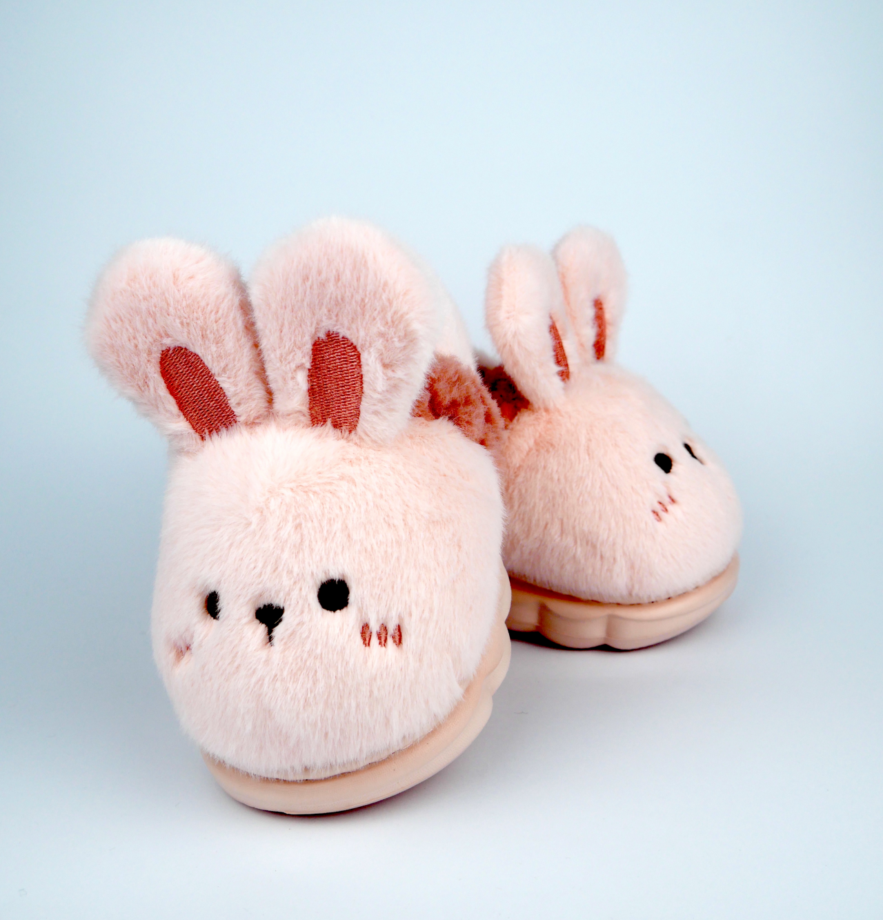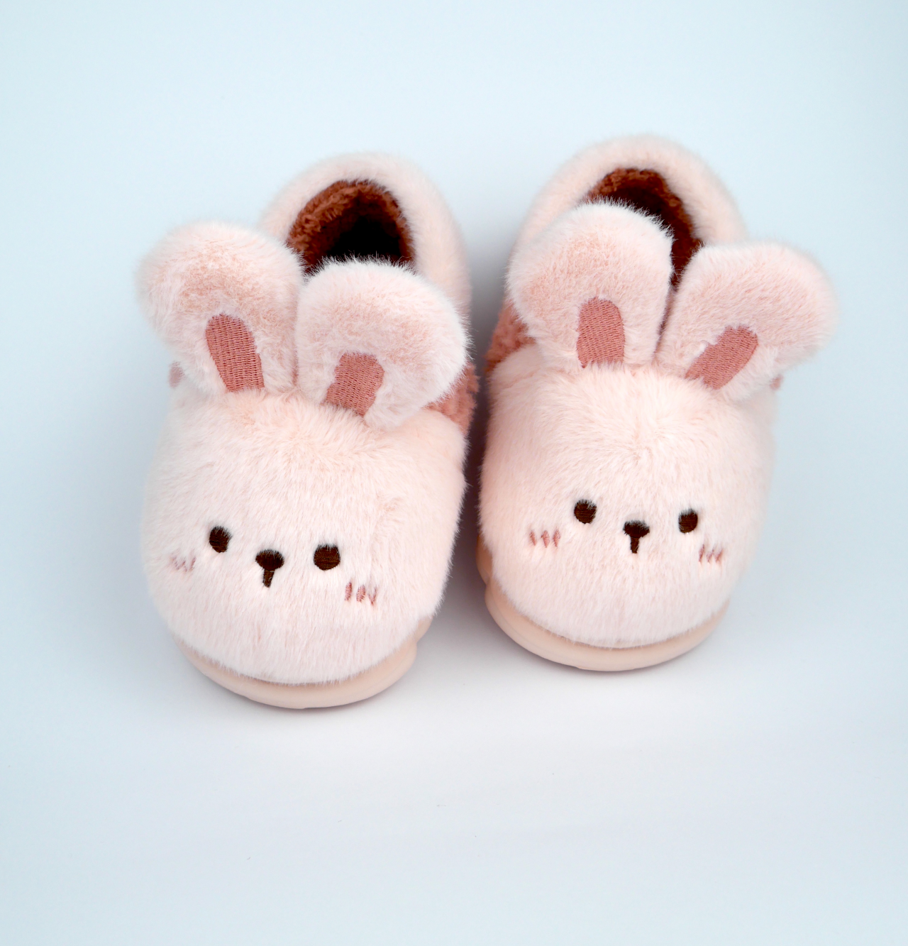 Чарівні маленькі капці виготовлені з м'якого світло-рожевого плюшу та прикрашені милою вишивкою мордочки зайчика з об'ємними вушками. Їхня закрита форма з теплою підкладкою дбайливо огортає ніжку, забезпечуючи малюку комфорт і затишок.