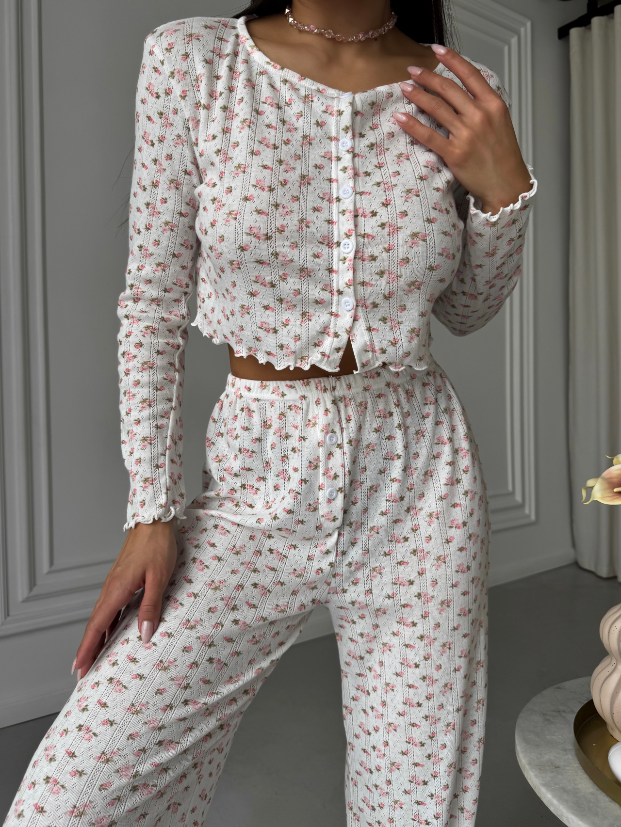 Ніжна жіноча піжама з квітковим принтом створена для комфорту та затишку вдома. М’яка тканина приємна до тіла, а зручний крій забезпечує свободу рухів. Ідеальний комплект для сну й домашнього відпочинку ✨