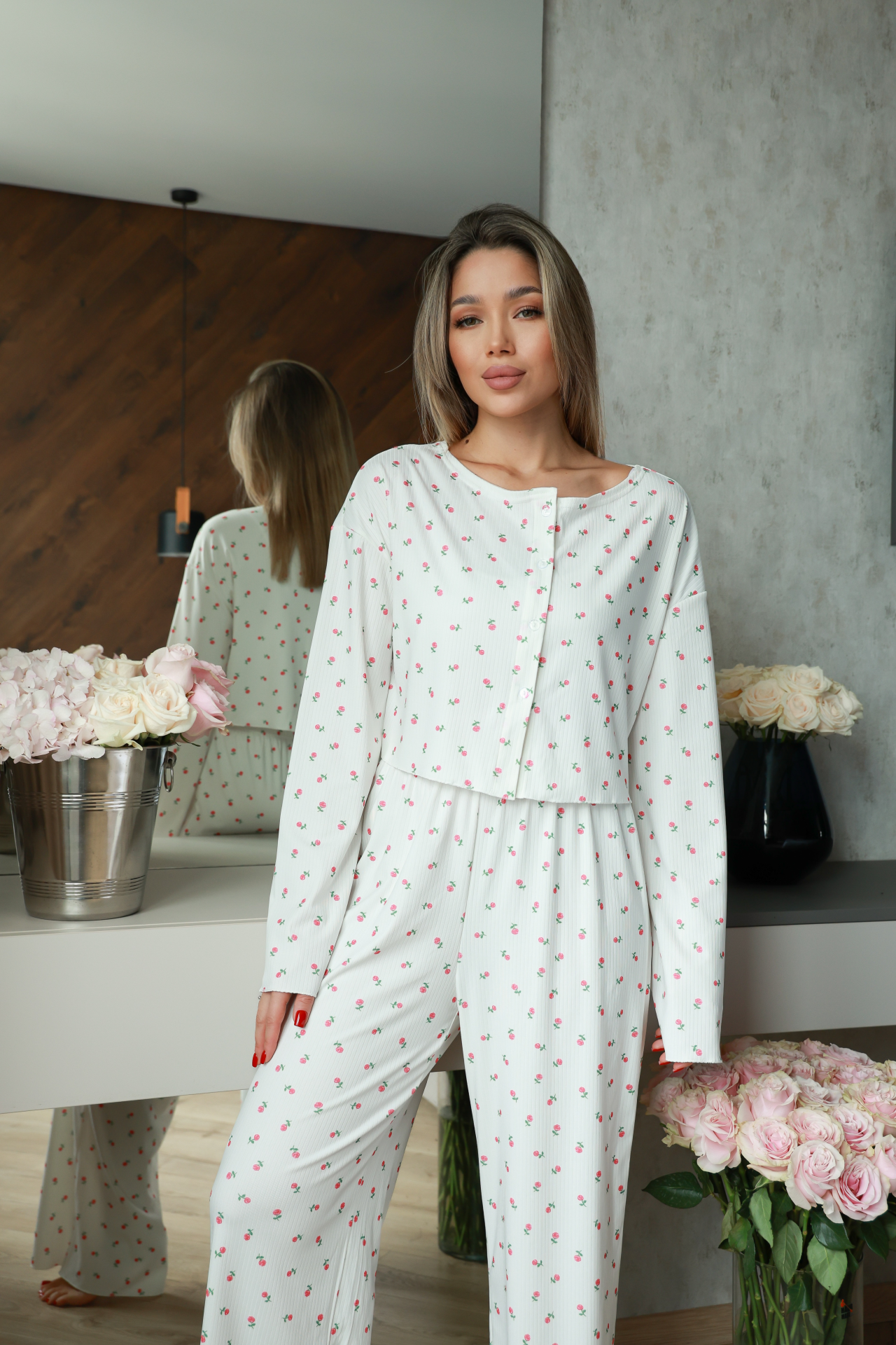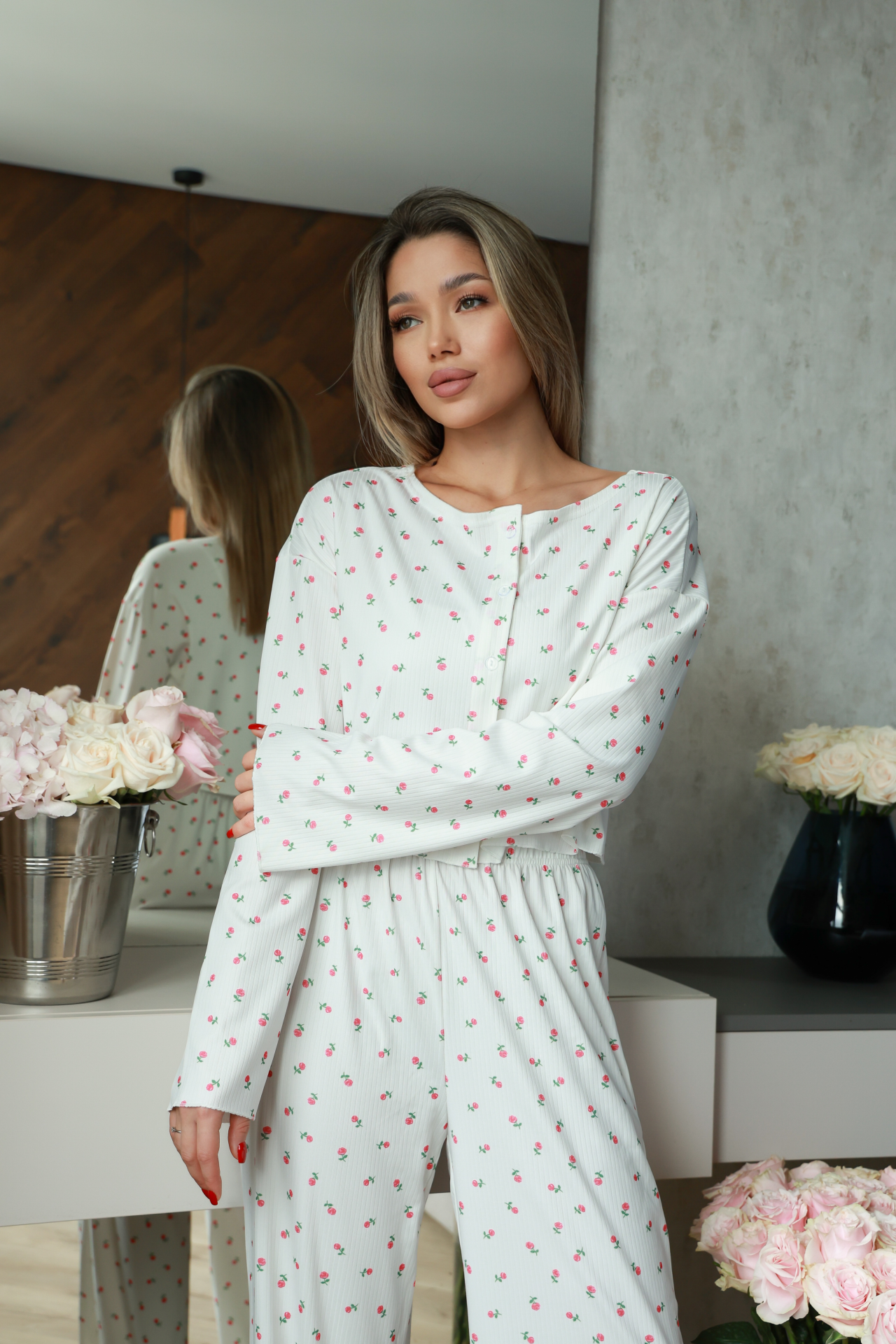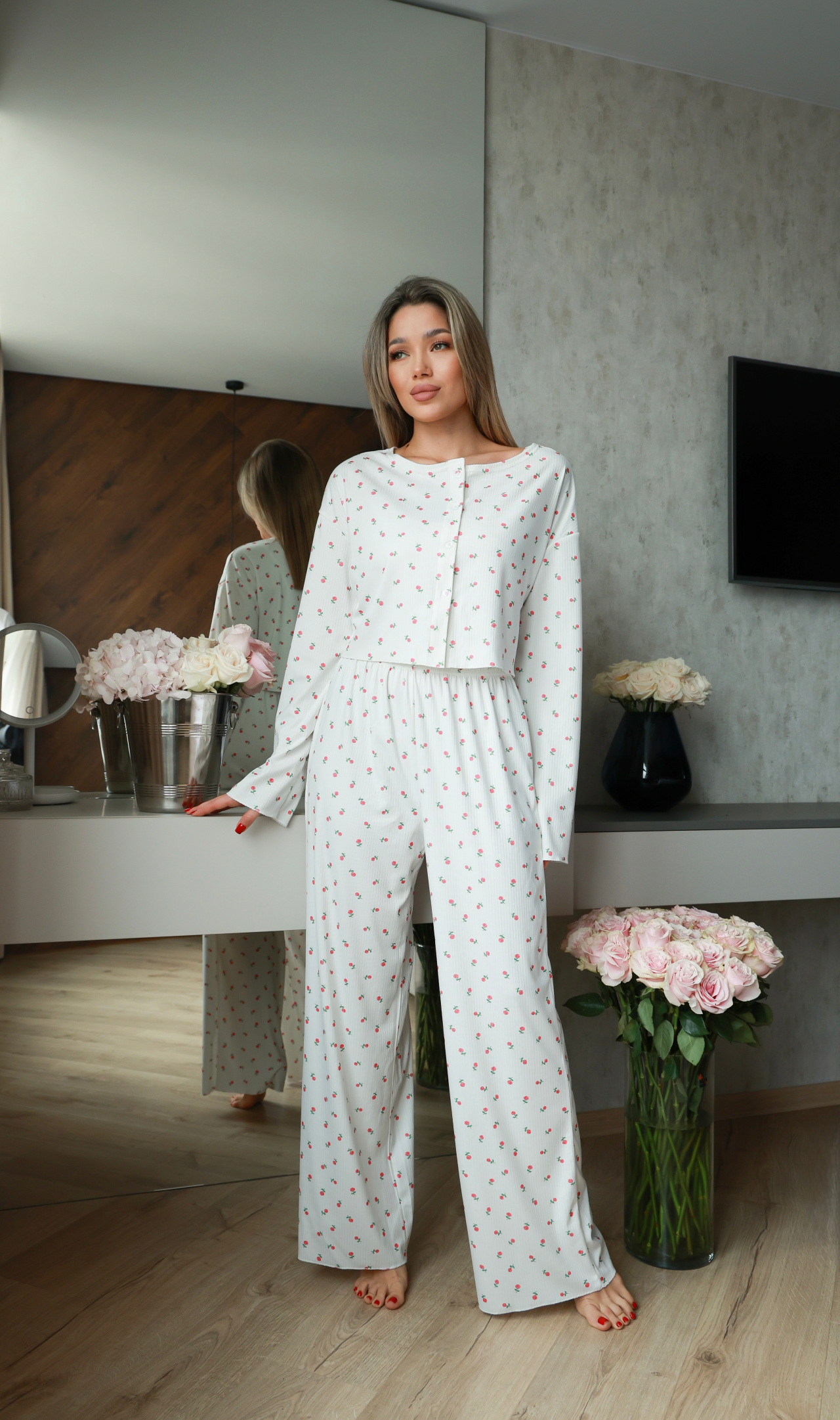 Жіноча піжама вільного крою з ніжним принтом вишні — ідеальний домашній комплект для сну та відпочинку. М’яка дихаюча тканина приємна до тіла, не парить і забезпечує комфорт протягом усього дня. Комплект складається з кофтинки на ґудзиках та вільних штанів, що не сковують рухів.