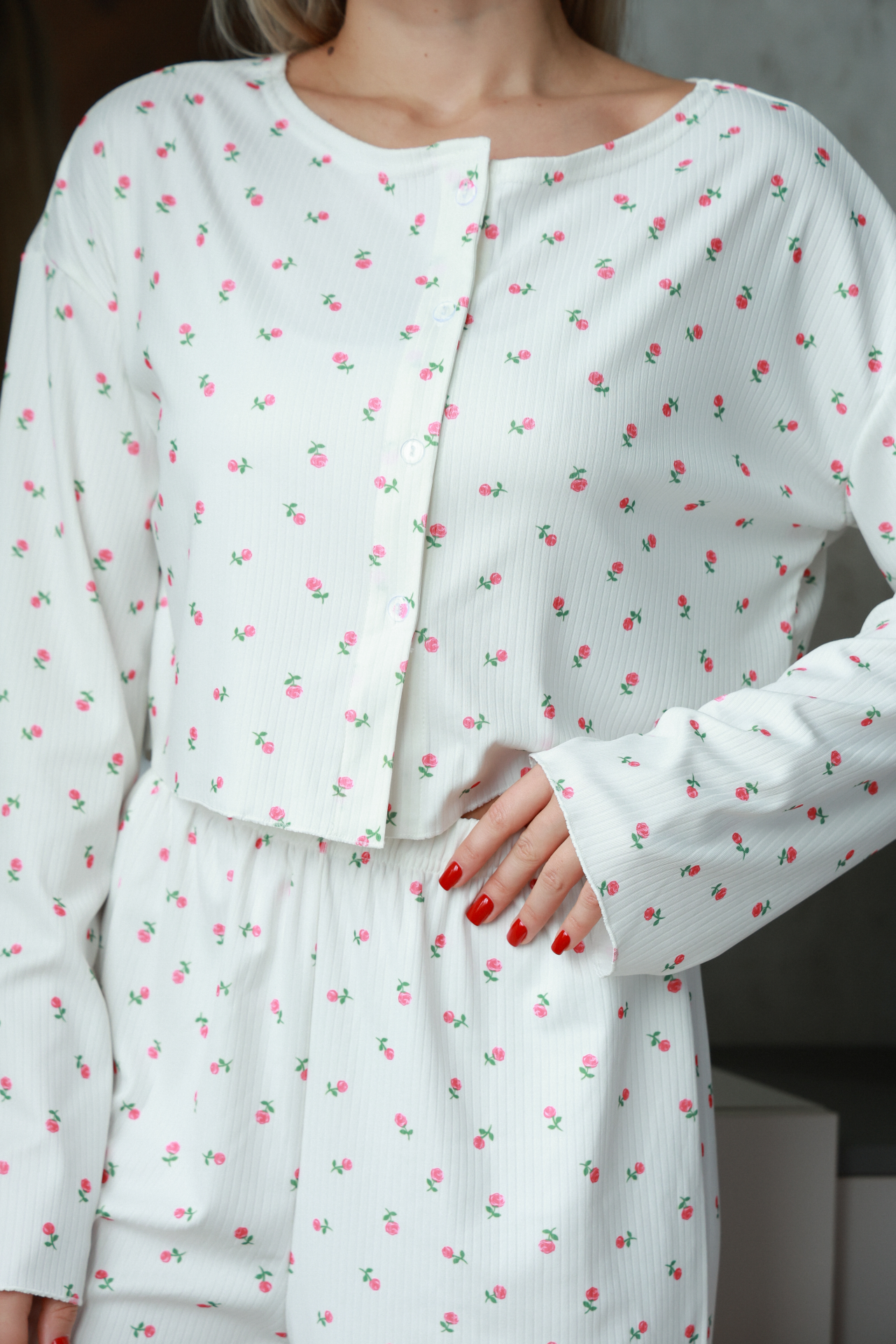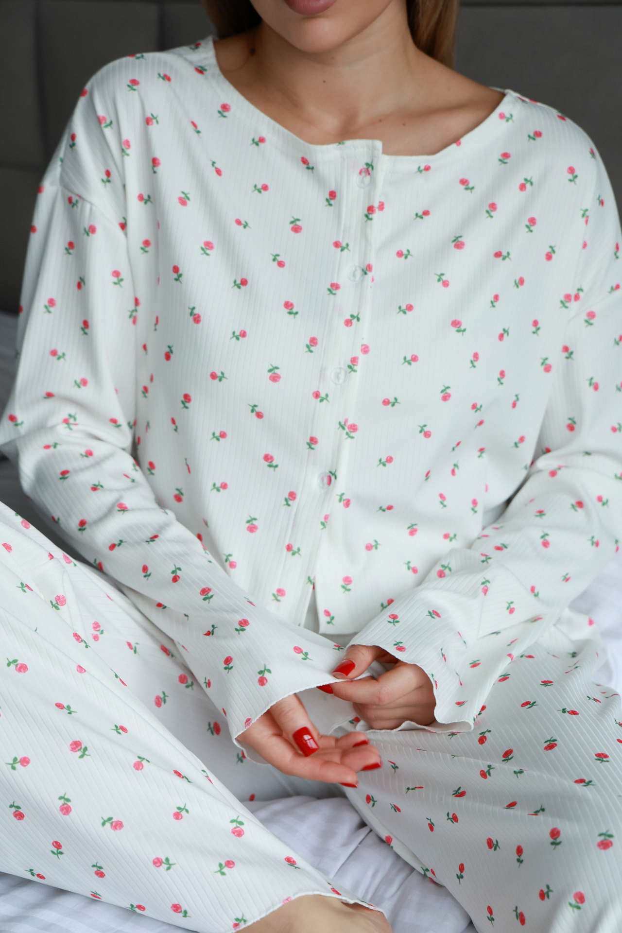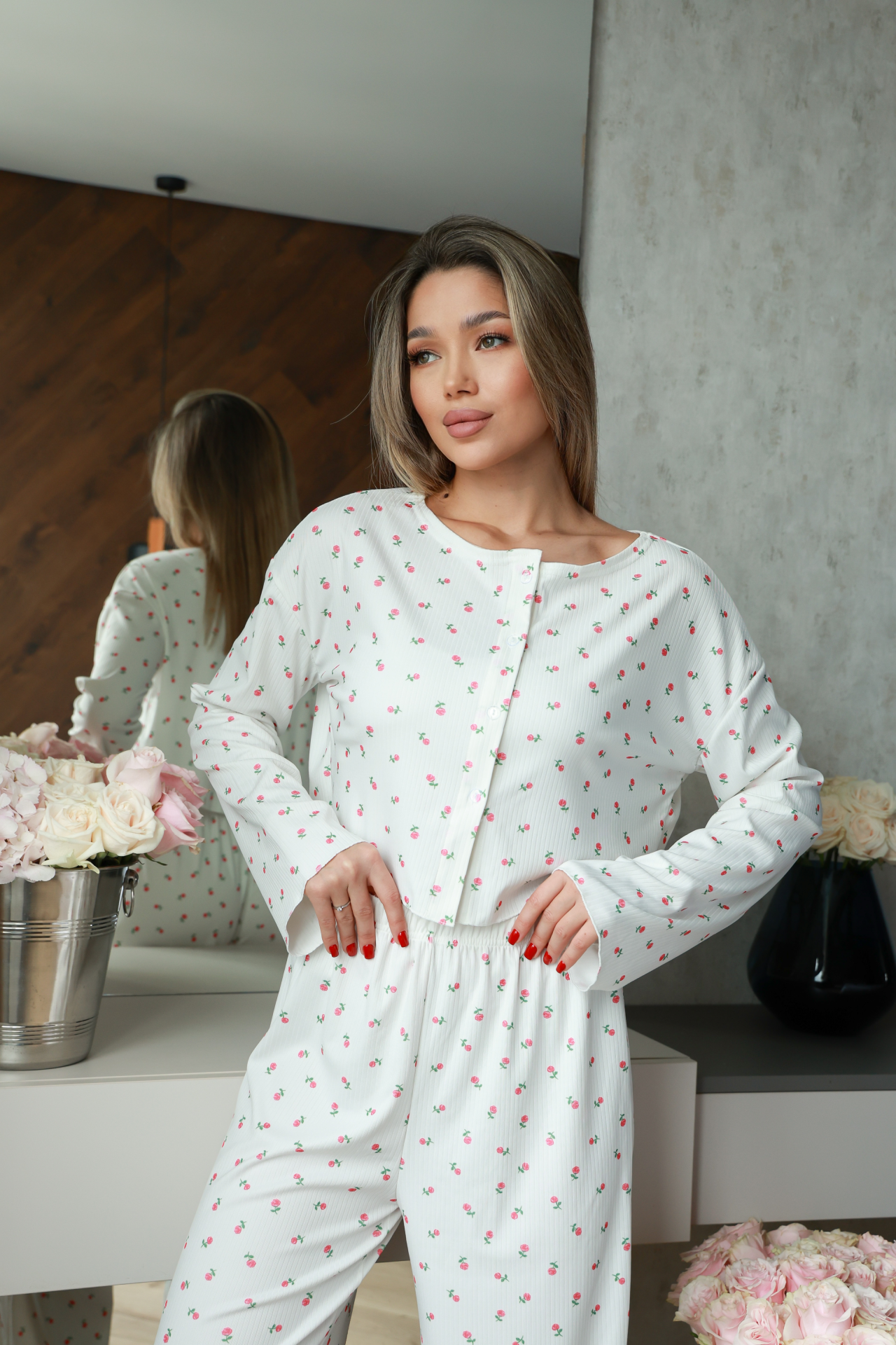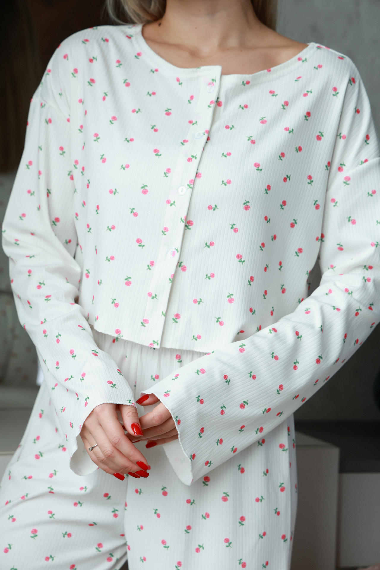 Жіноча піжама вільного крою з ніжним принтом вишні — ідеальний домашній комплект для сну та відпочинку. М’яка дихаюча тканина приємна до тіла, не парить і забезпечує комфорт протягом усього дня. Комплект складається з кофтинки на ґудзиках та вільних штанів, що не сковують рухів.