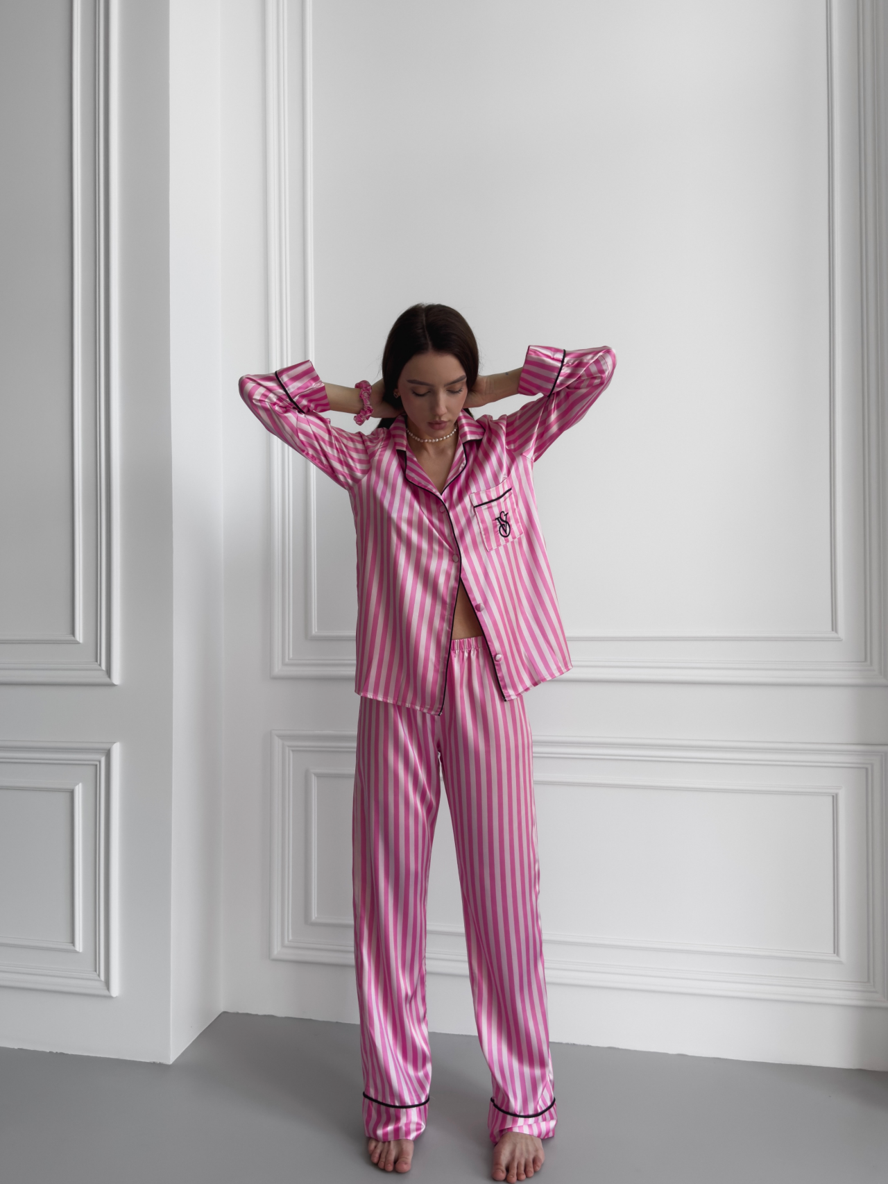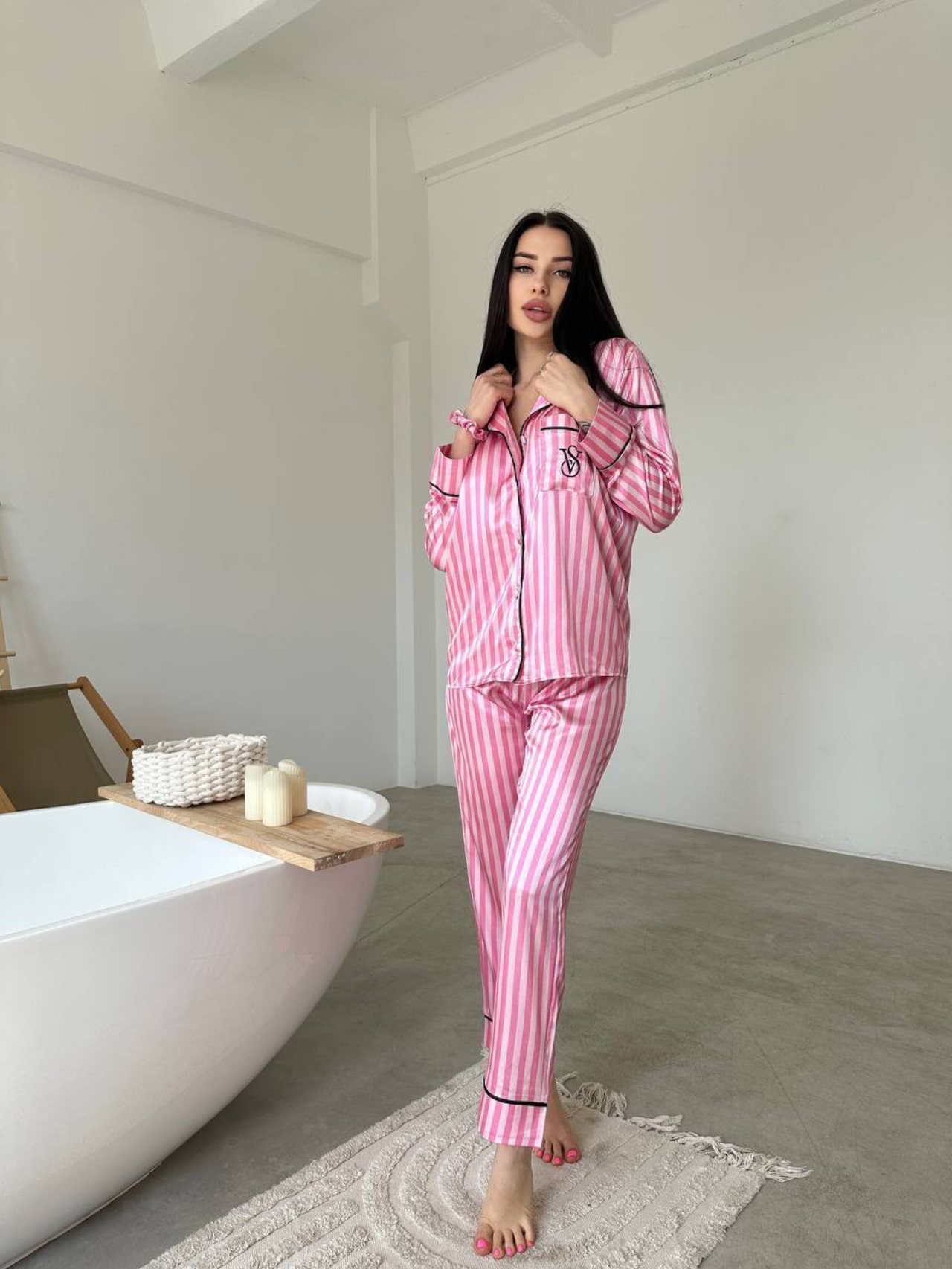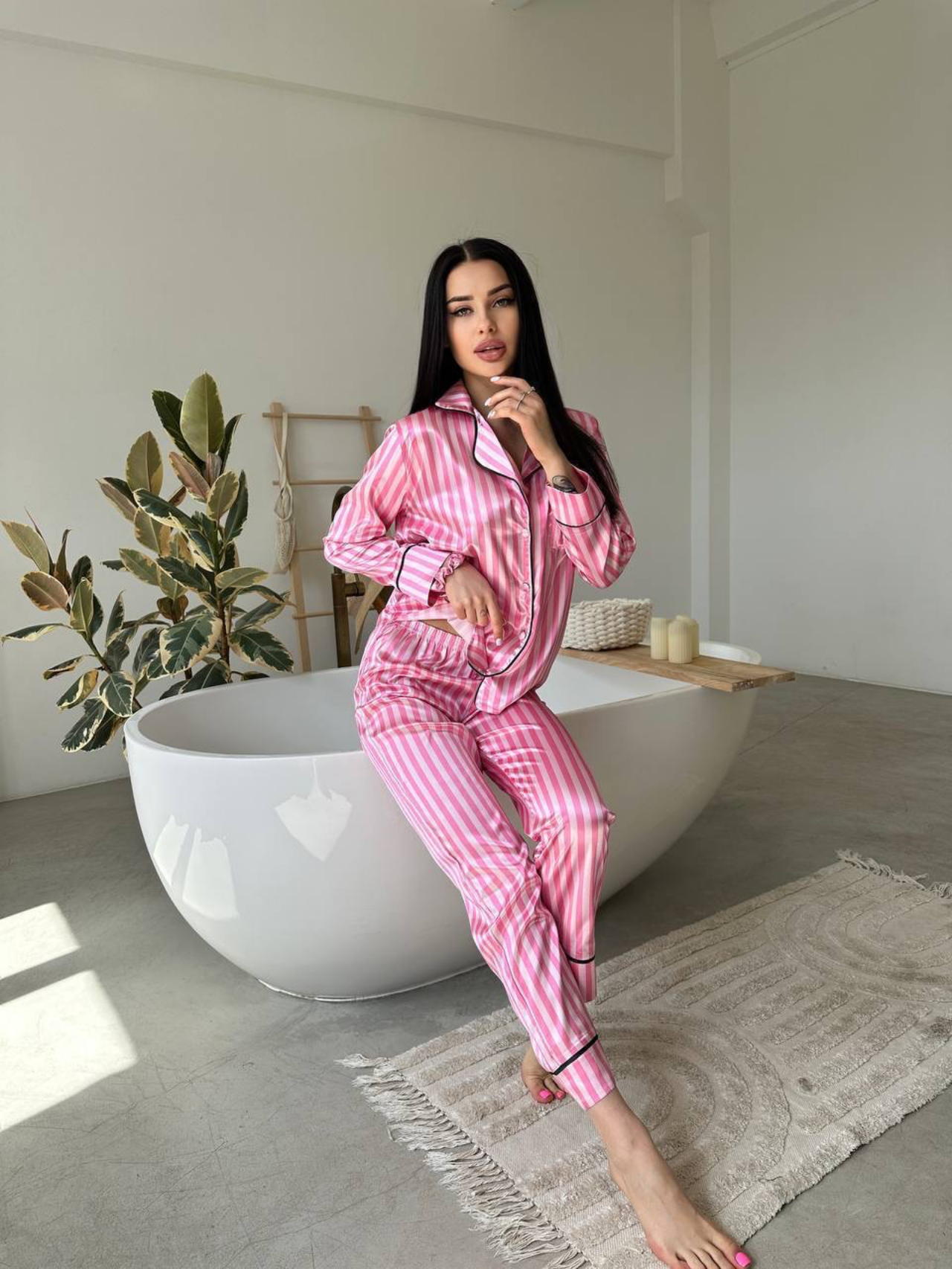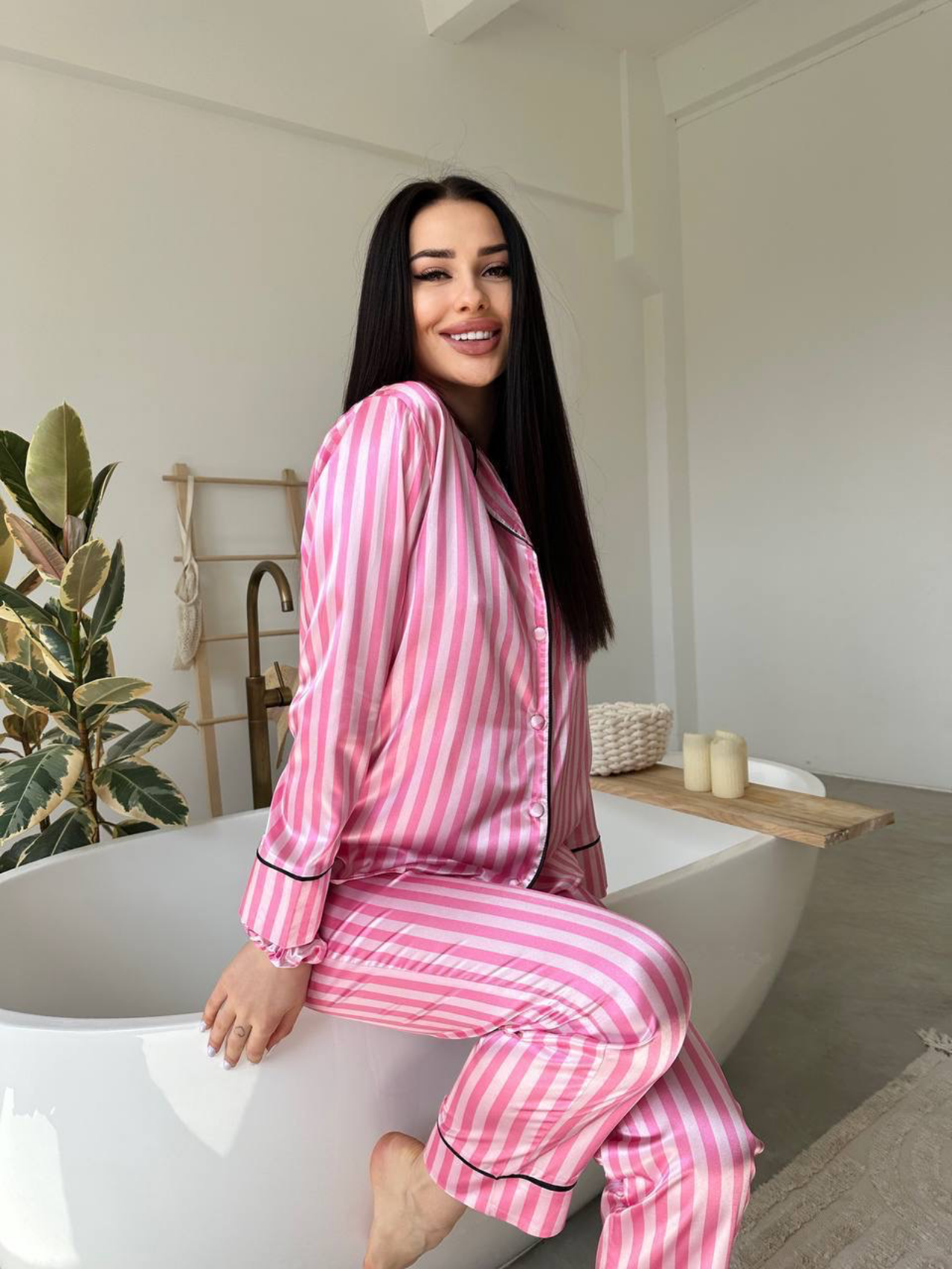 Стильна жіноча піжама з м’якого сатину поєднує комфорт і елегантність. Легка тканина приємна до тіла, а класичний крій ідеально підходять для сну та відпочинку вдома. Рожевий смугастий дизайн додає образу ніжності ✨