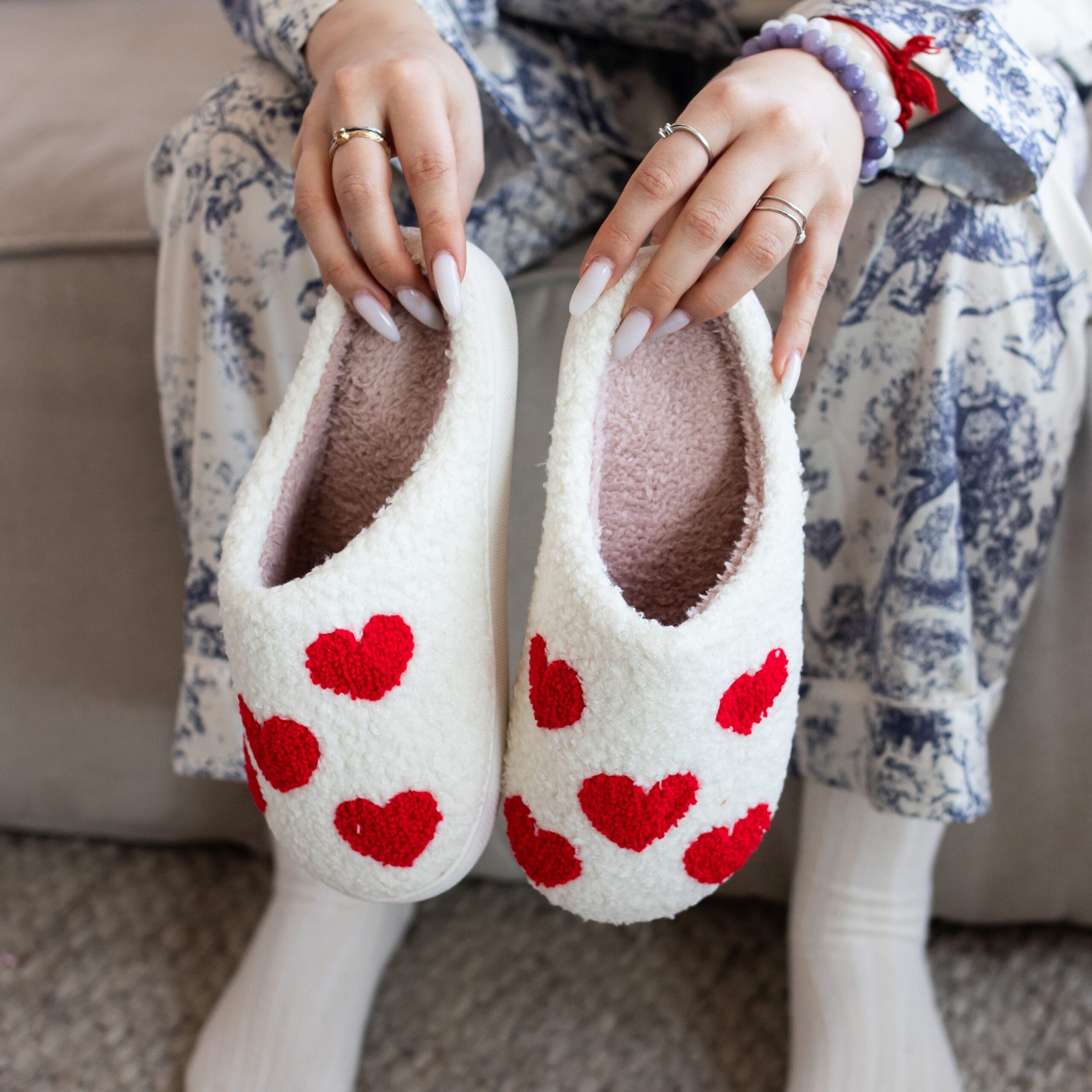 М'які плюшеві тапочки білого кольору із закритим носком декоровані яскравими червоними сердечками, що додають образу романтичності. Завдяки теплій хутряній текстурі всередині та зовні, вони ідеально зігрівають ноги та дарують відчуття повного комфорту.