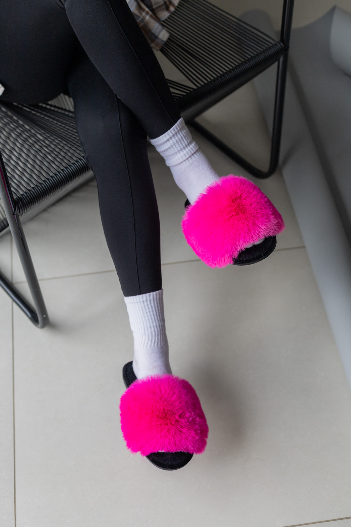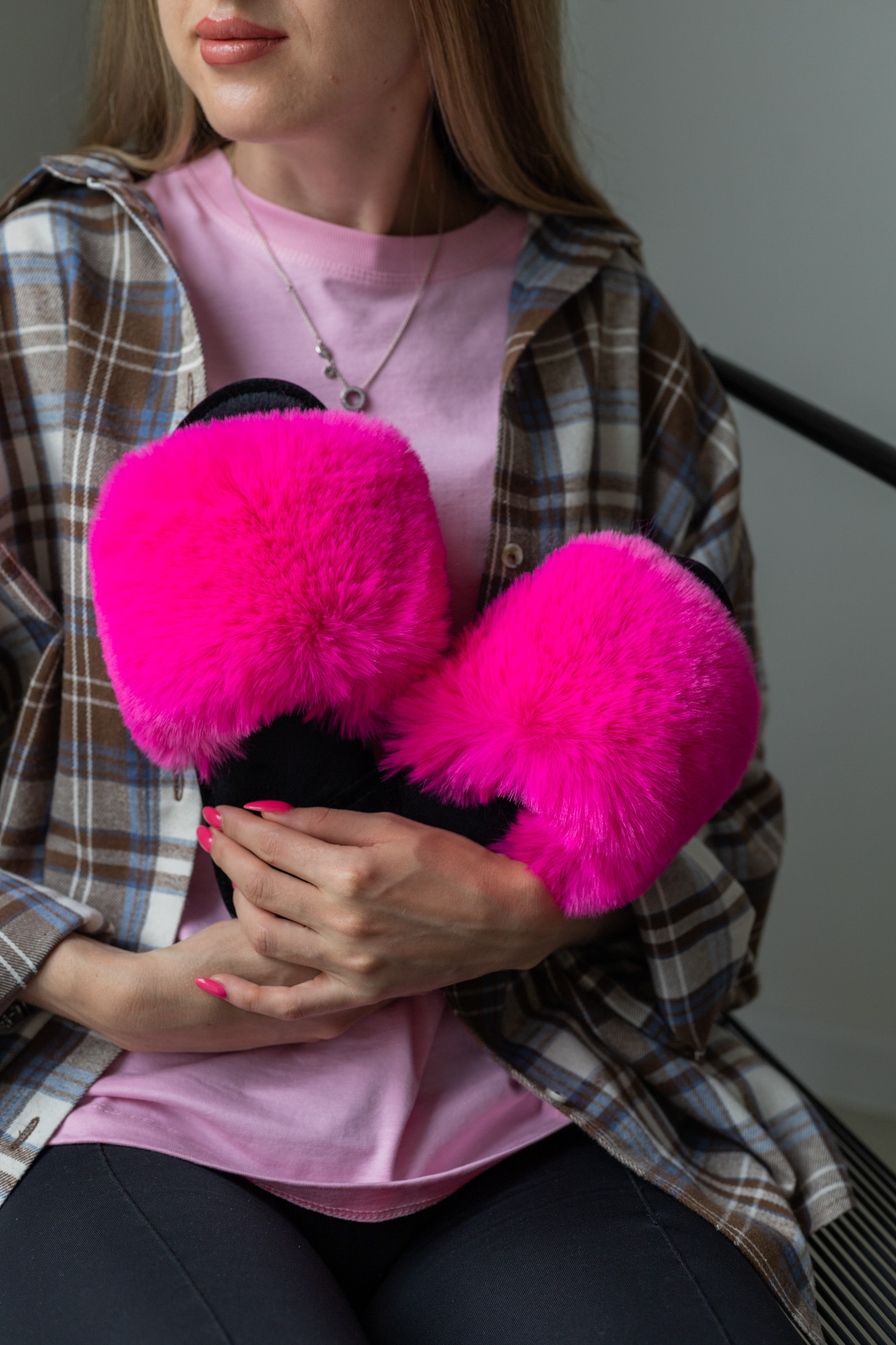 Чорна база врівноважує насичений верх, тому пара не виглядає перевантажено. Завдяки цьому малиново-чорні пухнасті капці добре сприймаються не лише як красива річ для фото, а як повноцінне домашнє взуття з настроєм і стилем.