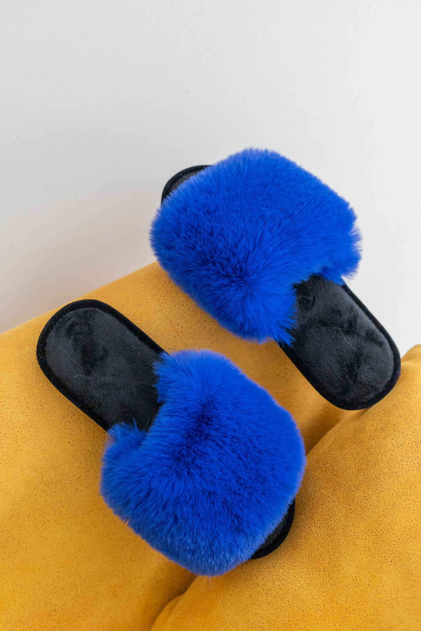 Така пара добре працює для тих, хто не хоче, щоб домашнє взуття було “непомітним”. Навпаки, жіночі пухнасті капці Halluci у синьо-чорному кольорі створюють чіткий характер і додають кольору в домашній гардероб без зайвого декоративного шуму.