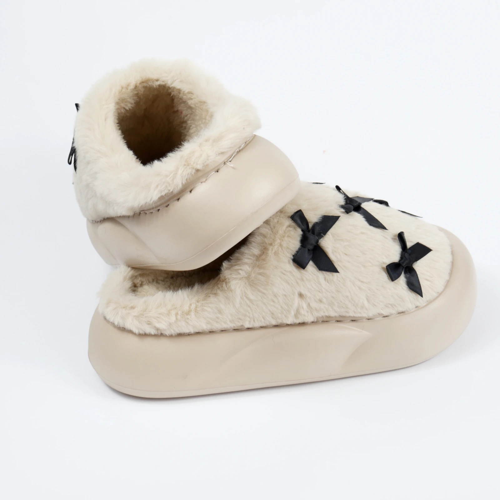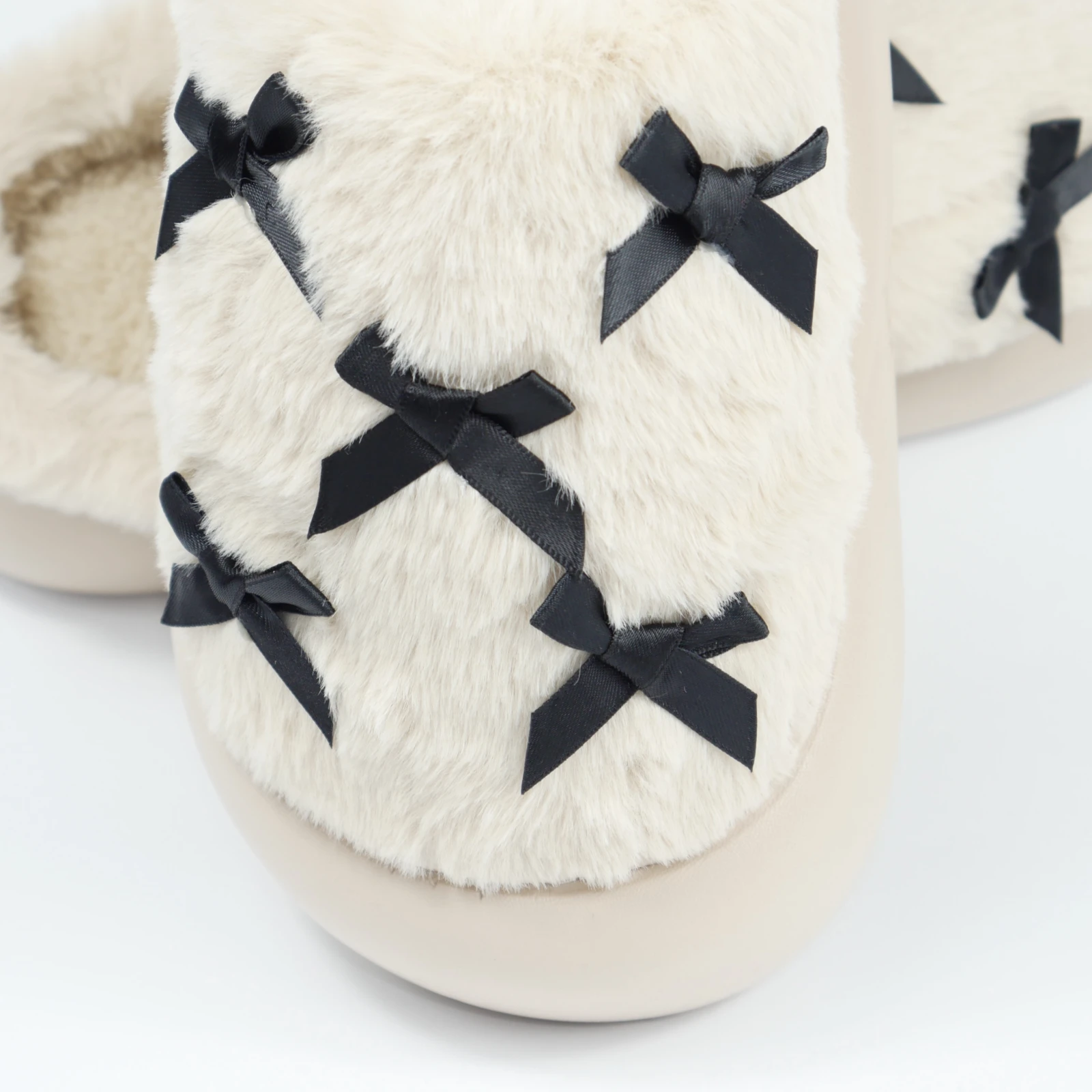 Це також вдалий варіант для тих, хто шукає теплі капці для дому, які виглядають не важко, а навпаки легко й охайно. Бантики не перевантажують модель, а лише додають завершеності.