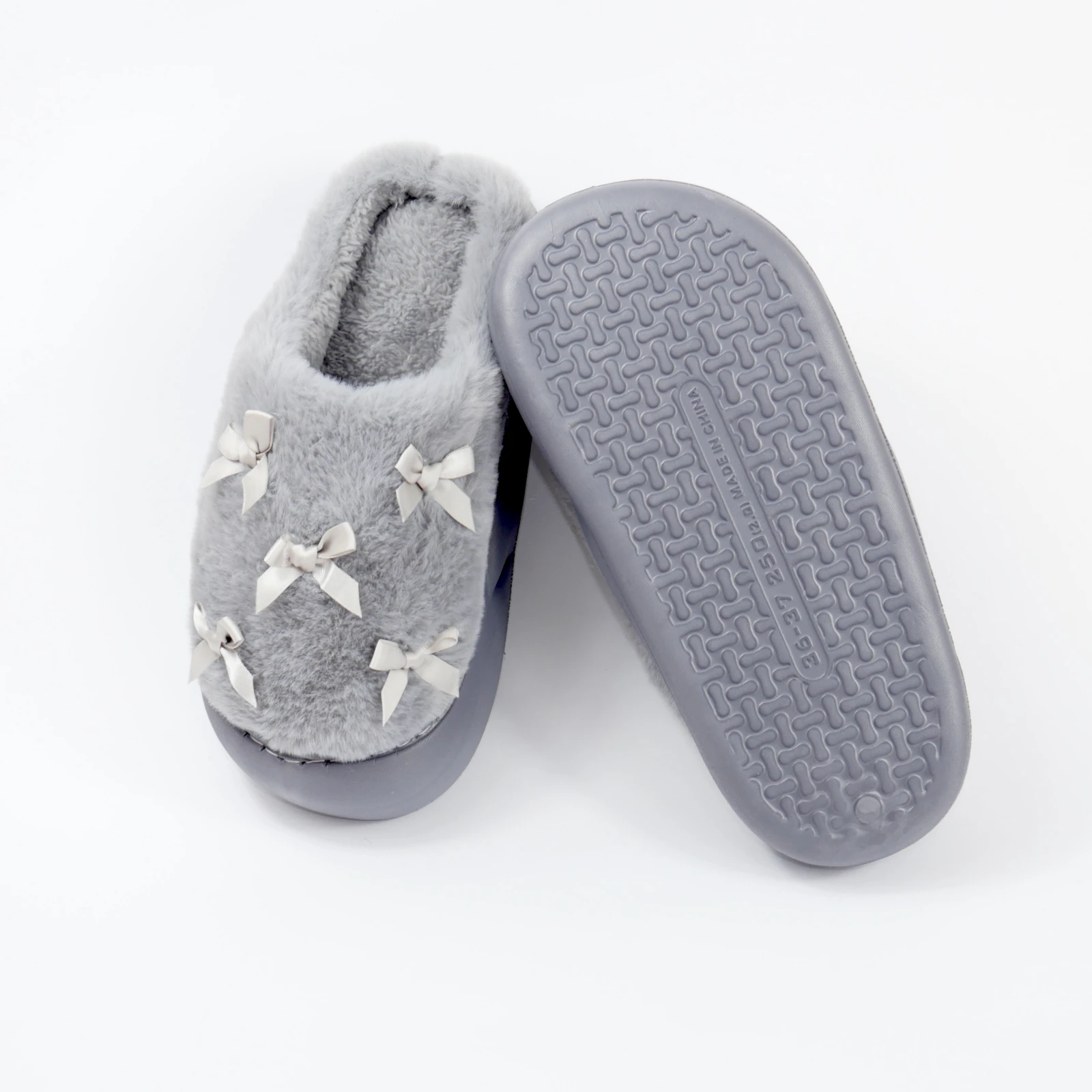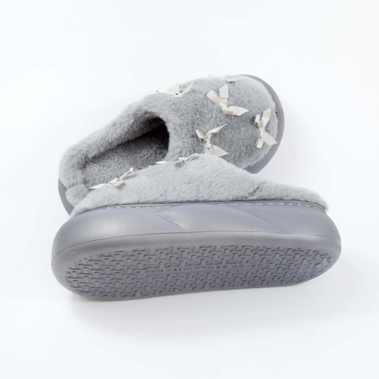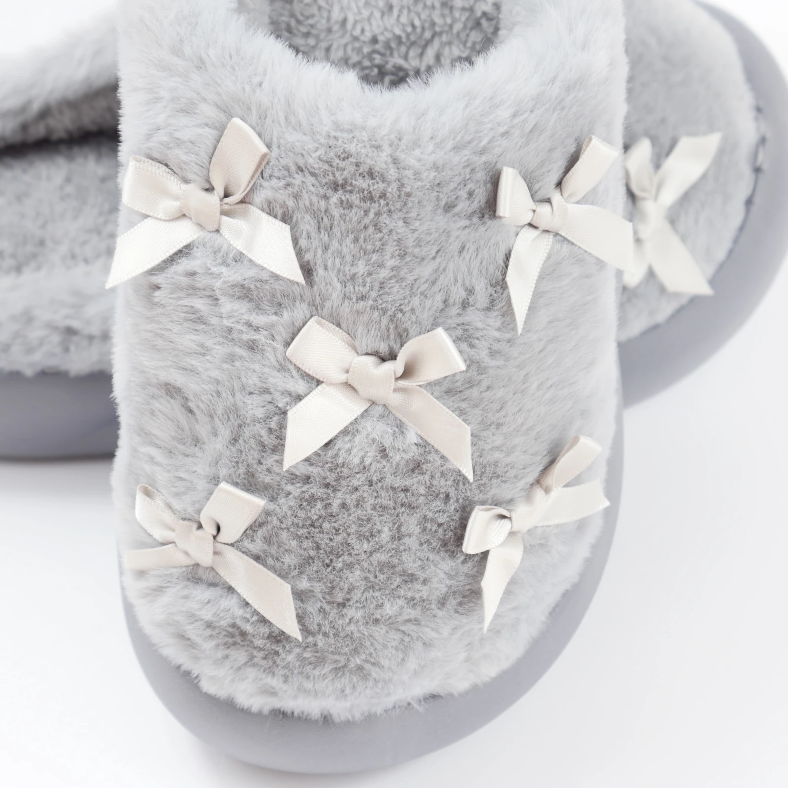 Сірі жіночі домашні капці з бантиками — стримана й затишна модель для тих, хто любить спокійні відтінки, практичність і м’який комфорт у домашньому взутті.